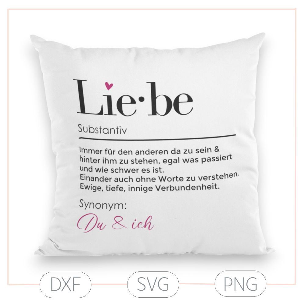 Liebe ist mehr als ein Wort: Mit der Plotterdatei „Liebe“ setzt du ein besonders emotionales Statement. Die dekorative Typografie kombiniert die Definition des Begriffs mit dem Schriftzug „Du & Ich“, den du ganz einfach anpassen kannst – perfekt, um individuelle Namen einzusetzen. Damit wird jedes Projekt zu einem ganz persönlichen Geschenk, ob für Hochzeiten, Jahrestage oder einfach für den Menschen, den du liebst.