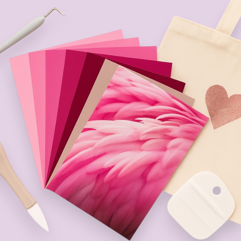 Das Rosé Romance Folienset vereint zarte Rosétöne mit kräftigem Magenta und besonderen Effektfolien. Ob sanft, verspielt oder glamourös – mit dieser Auswahl gestaltest du kreative Projekte voller Liebe und Eleganz. Ideal für Geschenkideen, Deko, Shirts oder festliche Accessoires.