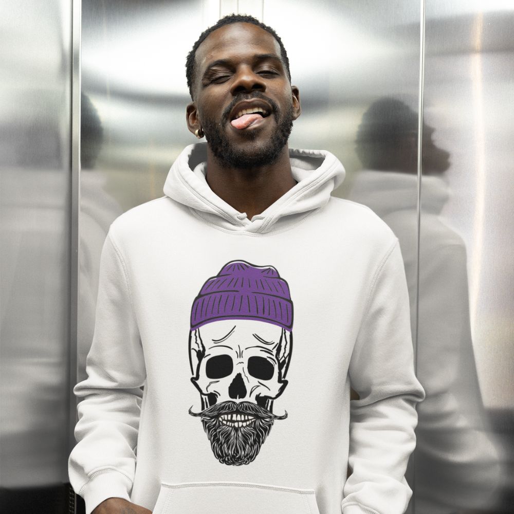 Der „Coole Manfred“ macht sich perfekt auf Hoodies, Caps oder Jutebeuteln. Besonders effektvoll wirkt er mit Flexfolie in Metallic oder mit Neonfarben, die das Skull-Motiv noch stärker betonen.