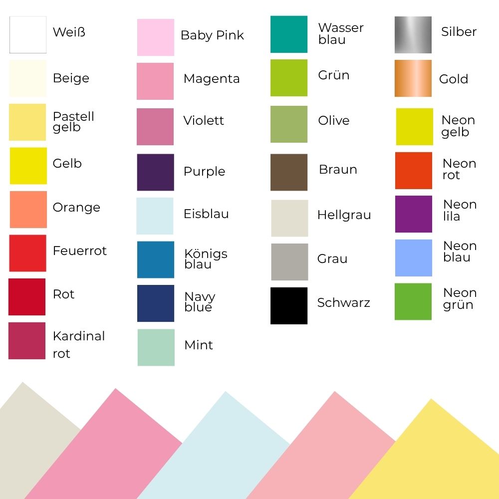 Bitte beachte, dass dies nur Vorgaben sind und je nach Aufpressverfahren (Bügeleisen, Transferpresse oder EasyPress), Messer- und Schneidematten Abnutzung immer variieren können.