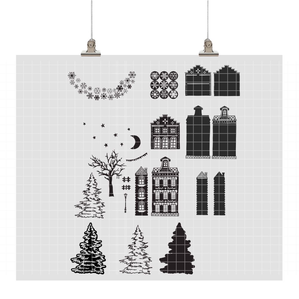 Kombiniere Häuser, Sterne und Schneeflocken zu einer ganzen Winterlandschaft auf Kissenhüllen oder Wandbildern. Auch für Adventskalender, Weihnachtskarten oder als Geschenkverpackung setzt das Set kreative Akzente, die garantiert festliche Stimmung verbreiten.